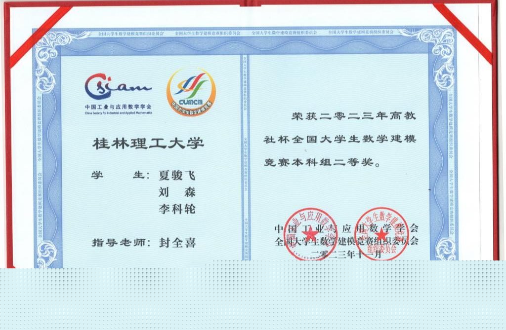 近日,2023年高教社杯全國大學生數(shù)學建模競賽完成廣西賽區(qū)總結及頒獎工作。我校共獲得全國一等獎1項、二等獎4項,廣西區(qū)一等獎10項、二等獎11項、三等獎25項。其中,陳仕磊、張俊超、閆家琪等3位同學榮獲專科組全國一等獎;夏駿飛、黃榮斌、高帥、郭杰等12位同學榮獲本科組全國二等獎。潘冬、艾武、孟兵和封全喜四位老師榮獲“廣西賽區(qū)優(yōu)秀指導老師”榮譽稱號,學校被評為“廣西賽區(qū)優(yōu)秀組織學?!薄?/span>