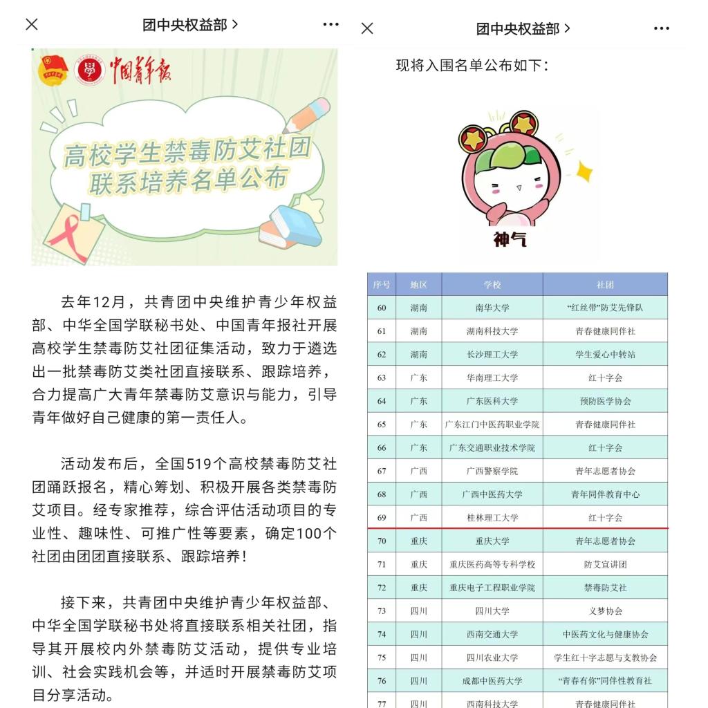 近日,共青團中央維護青少年權益部、中華全國學聯(lián)秘書處、中國青年報社公布了全國高校學生禁毒防艾社團聯(lián)系培養(yǎng)名單,我校學生社團紅十字會成功入選,全區(qū)共三所高校學生社團入選。