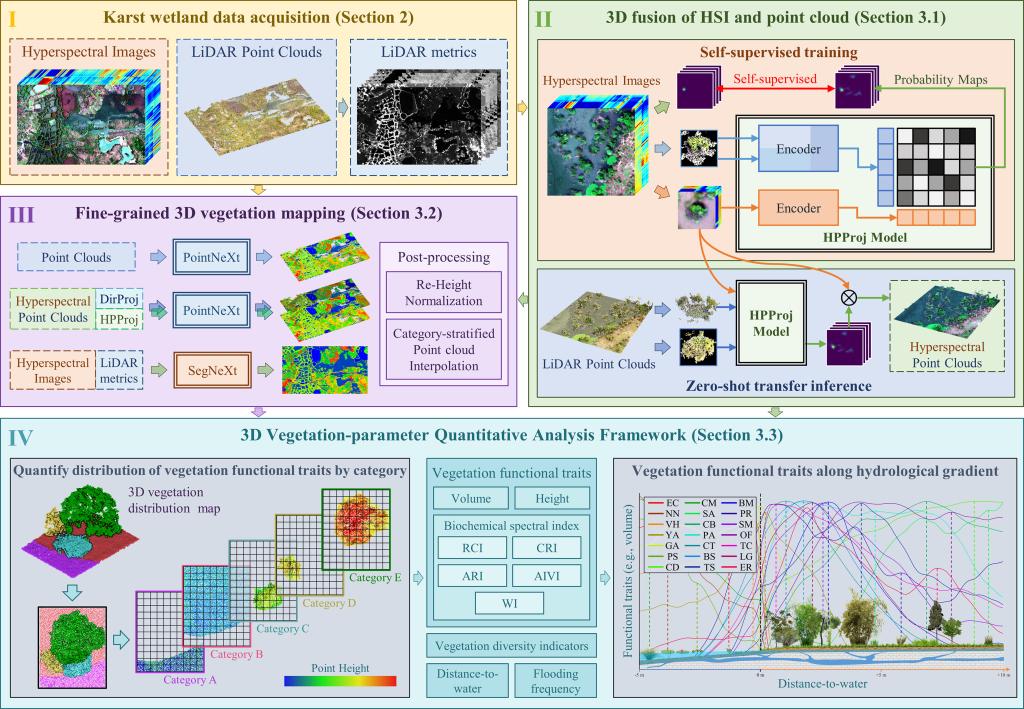 巖溶濕地是地球上獨特而寶貴的生態(tài)系統(tǒng)之一,由湖泊、河流、沼澤等地上和地下水體組成,健康的巖溶濕地不僅是最富有生物多樣性的生態(tài)系統(tǒng)之一,也是穩(wěn)定的碳匯資源庫,在全球碳固存和陸地碳循環(huán)中發(fā)揮著重要作用。然而,植被分布和生長狀況與濕地復(fù)雜的水文特征之間的關(guān)系一直是研究的難點。在具有復(fù)雜垂直結(jié)構(gòu)的濕地場景中,無人機LiDAR為植被遙感提供了一種快速有效的方法,能夠獲得包含精細植被結(jié)構(gòu)特征的3D點云數(shù)據(jù);高光譜傳感器則可以捕獲植被在多個精細波段上的反射率,為分類和反演研究提供了豐富信息。該研究提出了一種新穎的無監(jiān)督高光譜點云投影模型(HPProj),構(gòu)建了用于3D融合異步采集的高光譜影像與LiDAR點云的深度學(xué)習(xí)模型,生成了能同時準確表達植被空間結(jié)構(gòu)和光譜信息的高光譜點云,實現(xiàn)了廣西桂林會仙喀斯特國際重要濕地24類精細植被物種的3D制圖。高精度的3D植被物種分布圖準確地刻畫了濕地中各植被群落的分布及其形態(tài),為了充分利用這種新穎的數(shù)據(jù),該研究進一步提出了3D植被參數(shù)量化分析框架(3D-VQAF),通過制圖結(jié)果后處理、功能性狀量化、分布統(tǒng)計分析、沿水文梯度分析四個步驟,量化了每種植被的高度、體積、生化光譜指數(shù)在濕地中的分布情況,并依據(jù)其水文梯度進行統(tǒng)計,繪制了詳細的植被功能性狀淹水頻率和臨水距離梯度的曲線圖。該方法可以敏捷、精細地刻畫自然場景下植被物種功能性狀和水文梯度的空間關(guān)系,為中國乃至全球濕地的保護和可持續(xù)發(fā)展提供了技術(shù)支撐。
