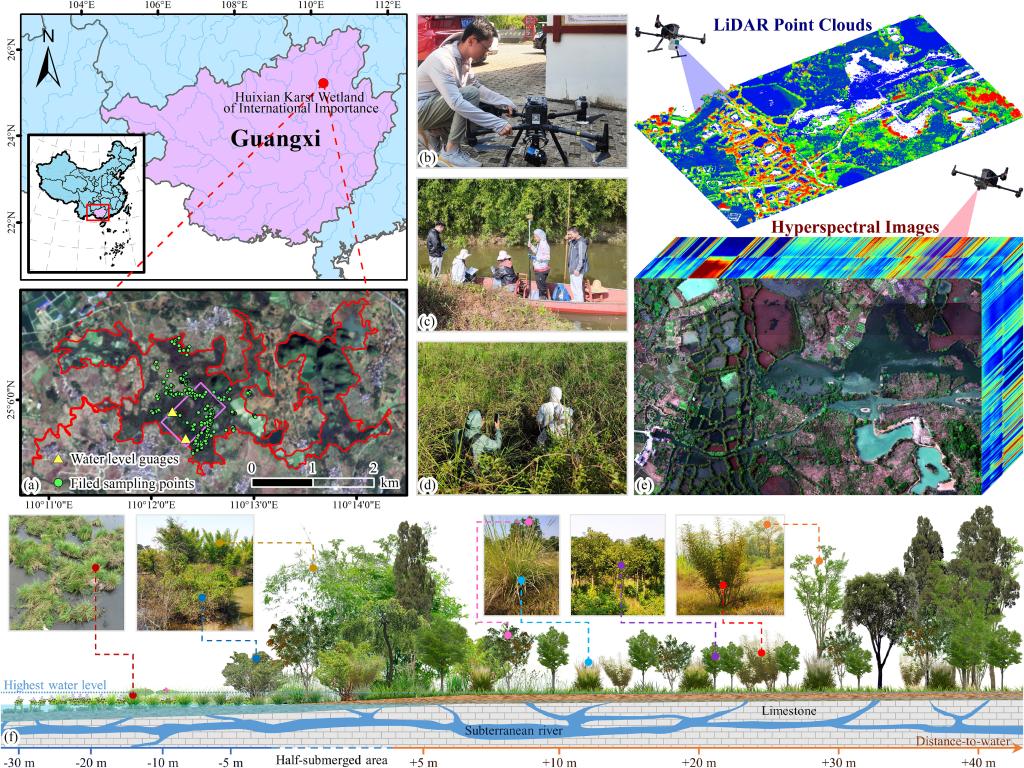 近日,我校測繪地理信息學(xué)院智能計算與遙感應(yīng)用實驗室的付波霖教授團隊在《Remote Sensing of Environment》(RSE)上發(fā)表題為“Quantifying vegetation species functional traits along hydrologic gradients in karst wetland based on 3D mapping with UAV hyperspectral point cloud”的研究成果。桂林理工大學(xué)測繪地理信息學(xué)院為第一完成單位,付波霖教授為第一作者,何宏昌教授為通訊作者。RSE是遙感領(lǐng)域影響力最高的學(xué)術(shù)期刊之一,為中科院一區(qū)TOPSCI期刊,2023年影響因子IF為13.5,CiteScore為24.8,在全球同類SCI學(xué)術(shù)期刊中長期排名第一。此次是我校首次以第一完成單位在RSE上發(fā)表原創(chuàng)研究文章。(全文鏈接為:https://doi.org/10.1016/j.rse.2024.114160)