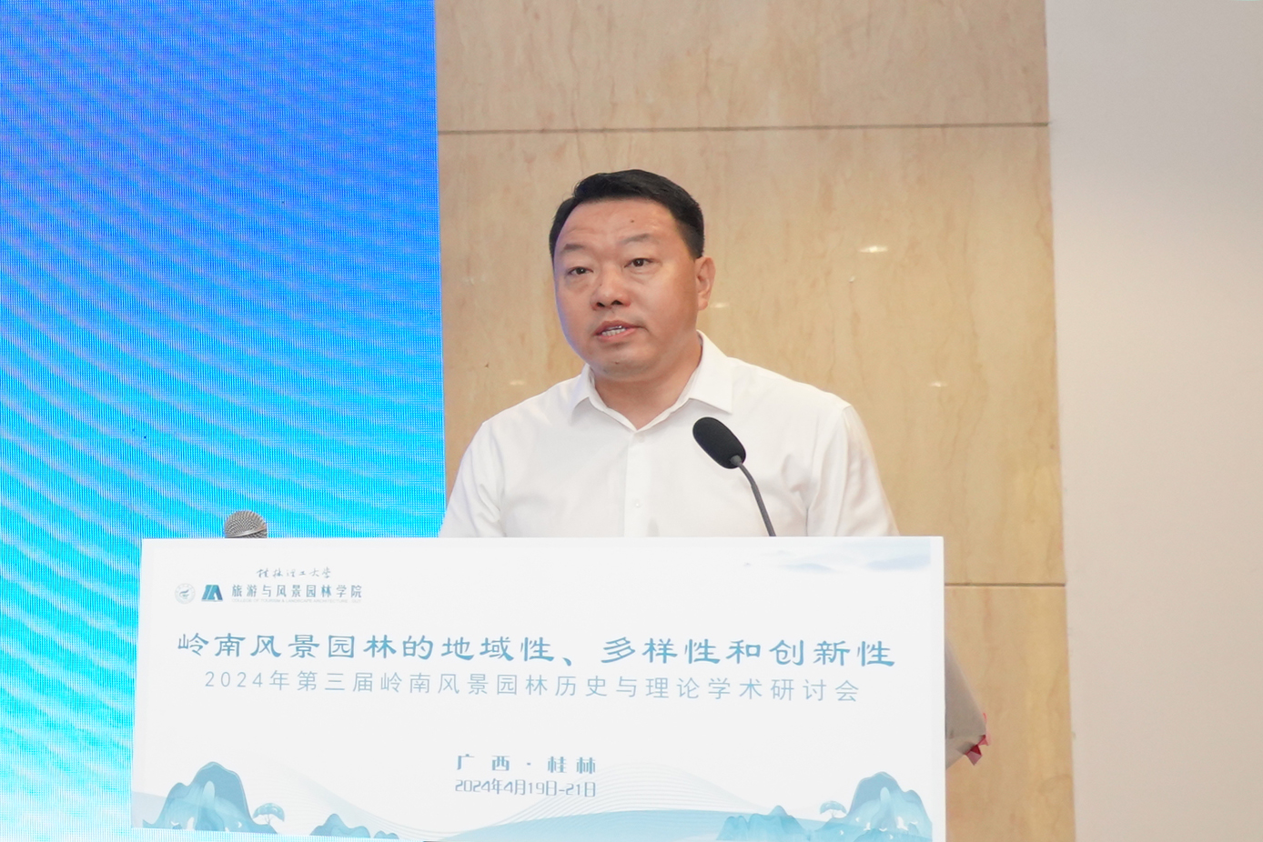 蘭波在致辭中希望與會(huì)人員積極參與討論,產(chǎn)出更多研究成果,為嶺南風(fēng)景園林發(fā)展、桂林建設(shè)世界級(jí)旅游城市和壯美廣西建設(shè)建言獻(xiàn)策。
