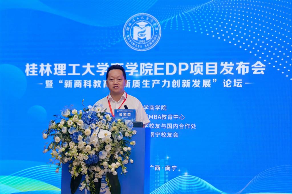 6月2日,學(xué)校EDP項(xiàng)目發(fā)布會暨“新商科教育與新質(zhì)生產(chǎn)力創(chuàng)新發(fā)展”論壇在南寧舉行。本次活動(dòng)由我校商學(xué)院主辦,MBA教育中心承辦,校友與國內(nèi)合作處、南寧校友會協(xié)辦。學(xué)校黨委常委、總會計(jì)師曾繁榮出席活動(dòng)并致辭,自治區(qū)科技廳原黨組書記、廳長陳大克出席活動(dòng),廣西日報(bào)、兄弟高校專家學(xué)者、企業(yè)、校友代表和學(xué)校校友與國內(nèi)合作處、商學(xué)院等相關(guān)負(fù)責(zé)人及師生代表100余人參加活動(dòng)。