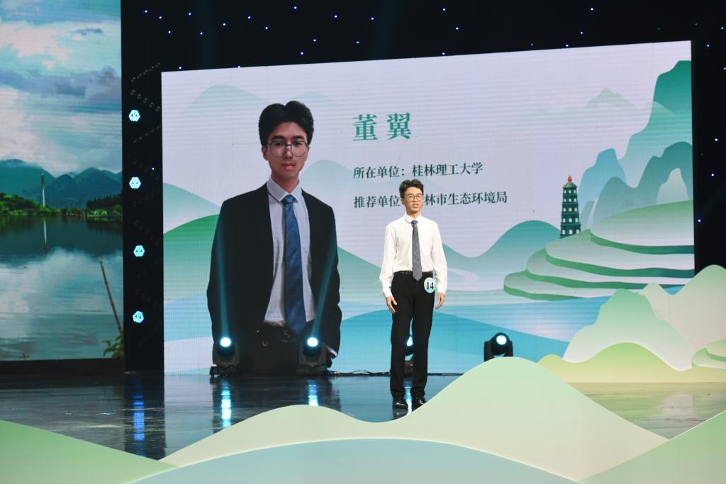 本次大賽共設(shè)置自主命題講解、隨機(jī)命題講解+知識問答、才藝展示三個比賽環(huán)節(jié),對選手的生態(tài)環(huán)保理論知識、專業(yè)素養(yǎng)以及環(huán)??萍紕?chuàng)新能力等方面進(jìn)行全方位、多角度考察。在自主命題環(huán)節(jié)中,董翼精心準(zhǔn)備,圍繞守護(hù)漓江生態(tài)屏障,帶領(lǐng)大家共同認(rèn)識和探索漓江生態(tài)屏障里的“大熊貓”——貓兒山。在隨機(jī)命題講解+知識問答環(huán)節(jié)中,董翼沉著冷靜、機(jī)智應(yīng)戰(zhàn),通過向觀眾分享常見的“寶藏”——礦泉水瓶,科普了“什么是固體廢物資源化”,同時呼吁大家尊重和愛護(hù)生態(tài)環(huán)境。