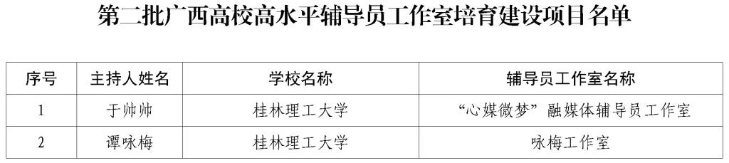 近日,《自治區(qū)教育廳關于公布第二批廣西高校高水平輔導員工作室培育建設項目名單的通知》(桂教思政〔2024〕11號)發(fā)布,經(jīng)推薦申報、專家評審、線上答辯等環(huán)節(jié),我?!靶拿轿簟比诿襟w輔導員工作室、詠梅工作室成功入選第二批廣西高校高水平輔導員工作室培育建設項目。