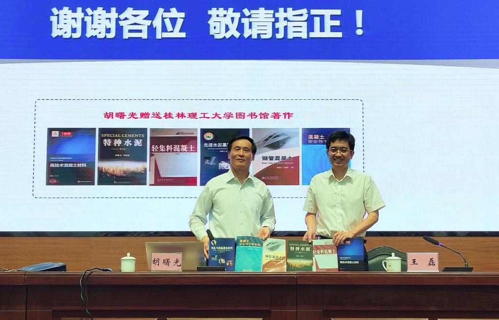 10月9日,胡曙光教授應(yīng)邀做客“桂工講壇”,在屏風(fēng)校區(qū)圖書館報告廳作題為“先進水泥基復(fù)合材料研究與應(yīng)用”的學(xué)術(shù)報告。王敦球校長、王磊副校長熱情接待了胡曙光教授,并贈送桂林理工大學(xué)聯(lián)名隕石套裝。土木工程學(xué)院和材料科學(xué)與工程學(xué)院師生200余人到場聆聽報告會。