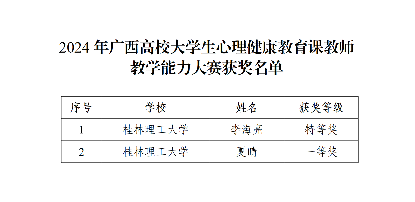 近日,廣西壯族自治區(qū)教育廳公布了2024年廣西高校大學(xué)生心理健康教育課教師教學(xué)能力大賽獲獎(jiǎng)名單。我校心理健康教育與咨詢中心教師李海亮、數(shù)學(xué)與統(tǒng)計(jì)學(xué)院輔導(dǎo)員夏晴,憑借扎實(shí)的知識(shí)儲(chǔ)備、良好的教學(xué)水平和靈活的應(yīng)變能力,分別榮獲大賽特等獎(jiǎng)、一等獎(jiǎng)。