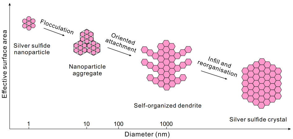 目前國(guó)內(nèi)外關(guān)于成礦過(guò)程中銀超常富集機(jī)理的認(rèn)識(shí)非常薄弱,本項(xiàng)研究工作創(chuàng)新性地提出銀硫化物納米粒子自組織聚合,先后形成納米粒子集合體和亞微米粒子、樹(shù)枝狀銀硫化物,通過(guò)進(jìn)一步充填和自組織形成具有晶體形態(tài)的銀硫化物。外部環(huán)境的改變(如硫逸度、電場(chǎng)、溫度等)可促使銀硫化物向自然銀轉(zhuǎn)化,通過(guò)固態(tài)銀離子聚合的方式形成發(fā)絲狀自然銀。上述有關(guān)銀的富集機(jī)制解釋了高品位銀礦石的成因,得到國(guó)際同行專家高度認(rèn)可。