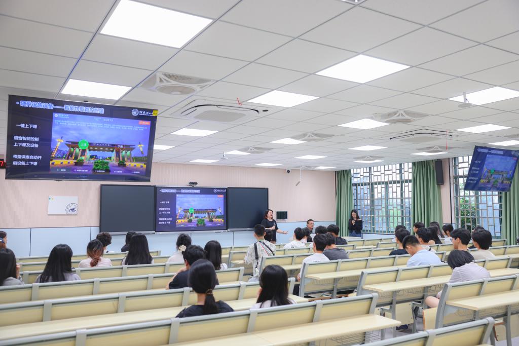 在智慧教室的參觀中,科技感十足的教學(xué)設(shè)備成為焦點(diǎn)。智能交互大屏以動(dòng)態(tài)畫面展示教學(xué)內(nèi)容,錄播平臺(tái)與巡課系統(tǒng)實(shí)現(xiàn)遠(yuǎn)程教學(xué)與實(shí)時(shí)反饋;吊麥、光電黑板等硬件設(shè)備,讓傳統(tǒng)課堂升級(jí)為高效互動(dòng)的“數(shù)字空間”。工作人員現(xiàn)場演示黑板的觸控書寫、吊麥的清晰收音等功能,流暢的操作與便捷的體驗(yàn)引發(fā)同學(xué)們陣陣贊嘆,科技賦能教育的創(chuàng)新模式,讓大家對(duì)未來課堂充滿期待。