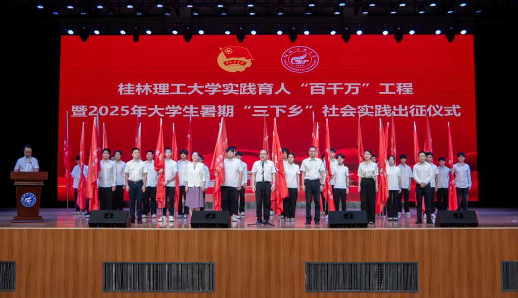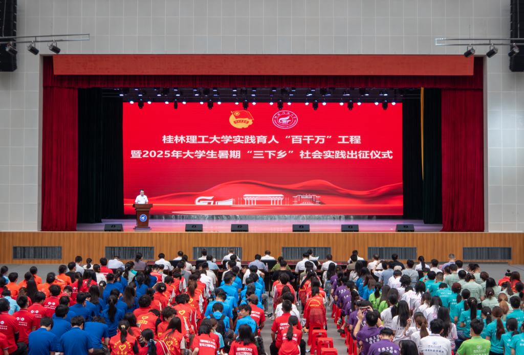7月10日,學(xué)校實(shí)踐育人“百千萬”工程暨2025年大學(xué)生暑期“三下鄉(xiāng)”社會(huì)實(shí)踐出征儀式在雁山校區(qū)新體育館舉行。學(xué)校黨委常委、副校長唐壯東出席活動(dòng)并作動(dòng)員講話,組織部、宣傳部、學(xué)工部、研工部、校團(tuán)委相關(guān)負(fù)責(zé)人,各學(xué)院分管學(xué)生工作黨委副書記、團(tuán)委書記、學(xué)校社會(huì)實(shí)踐立項(xiàng)團(tuán)隊(duì)指導(dǎo)老師和學(xué)生代表共600余人參加出征儀式。
