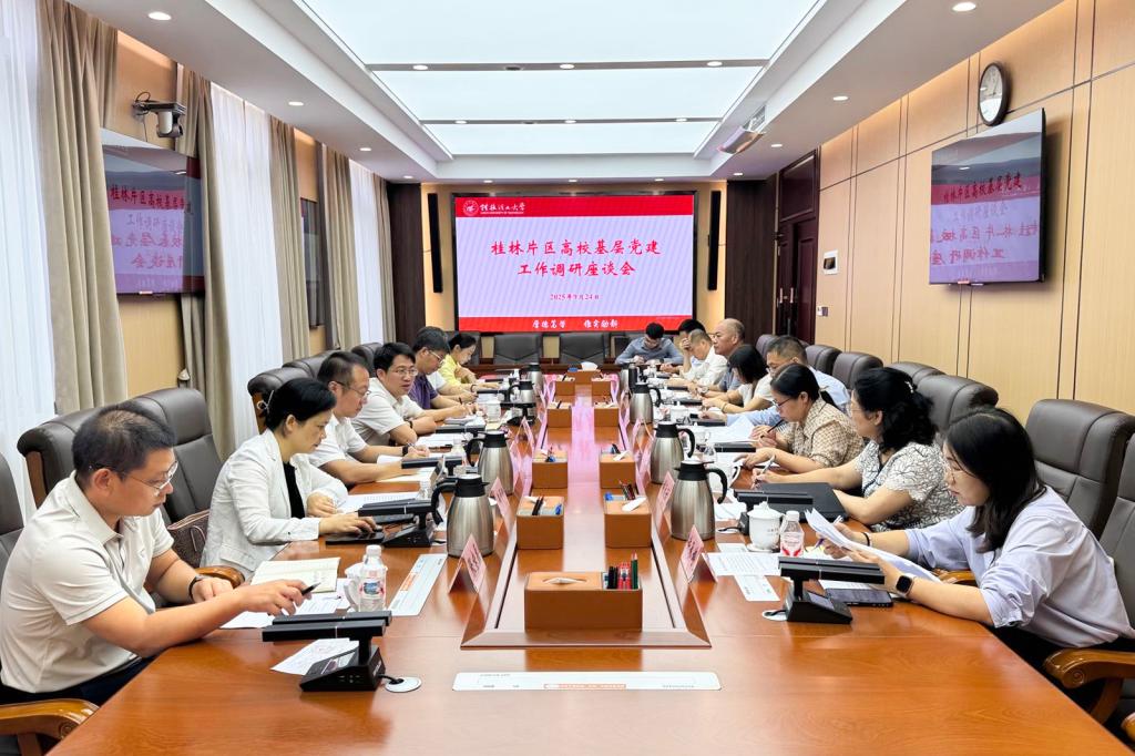 9月24日,桂林片區(qū)高?;鶎狱h建工作調(diào)研座談會在我校召開。自治區(qū)黨委教育工委組織部副部長賀志超主持座談會并講話。桂林片區(qū)12所高校負責基層黨建工作相關負責人參加會議。
