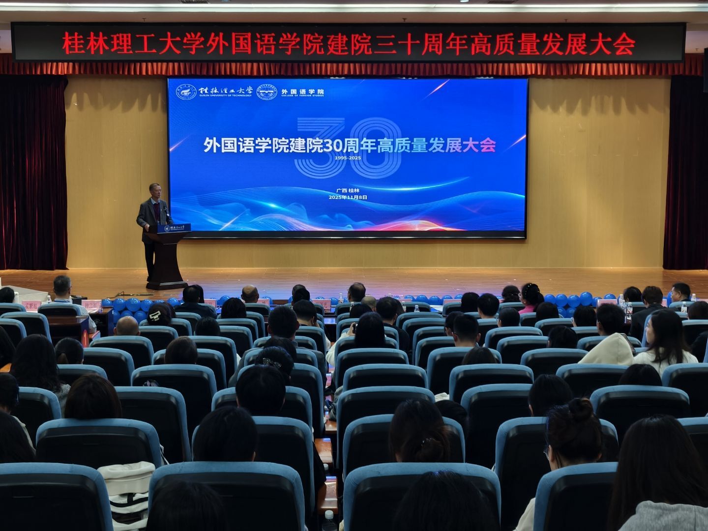 11月8日,我校外國(guó)語(yǔ)學(xué)院建院30周年高質(zhì)量發(fā)展大會(huì)在雁山校區(qū)圖書(shū)館報(bào)告廳舉行。學(xué)校黨委常委、副校長(zhǎng)唐壯東出席大會(huì)。學(xué)院黨政領(lǐng)導(dǎo)班子、歷任老領(lǐng)導(dǎo)、離退休老教師、校友代表以及師生代表200余人齊聚一堂,共慶學(xué)院三十華誕,共繪高質(zhì)量發(fā)展新藍(lán)圖。