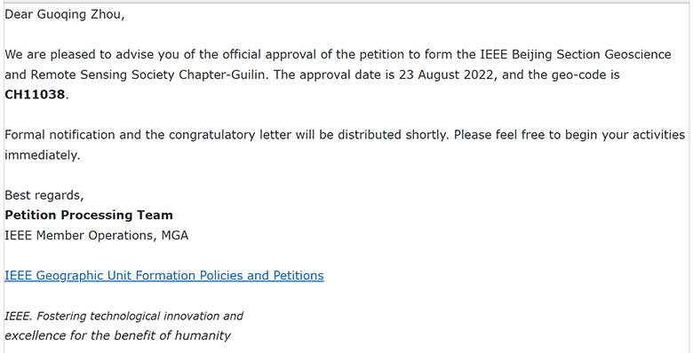 美國IEEE總部郵件同意在我校成立GRSS Guilin Chapter