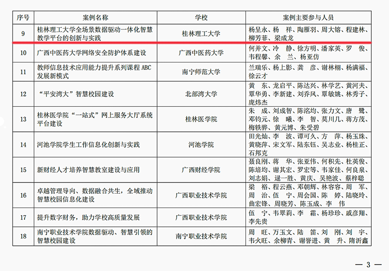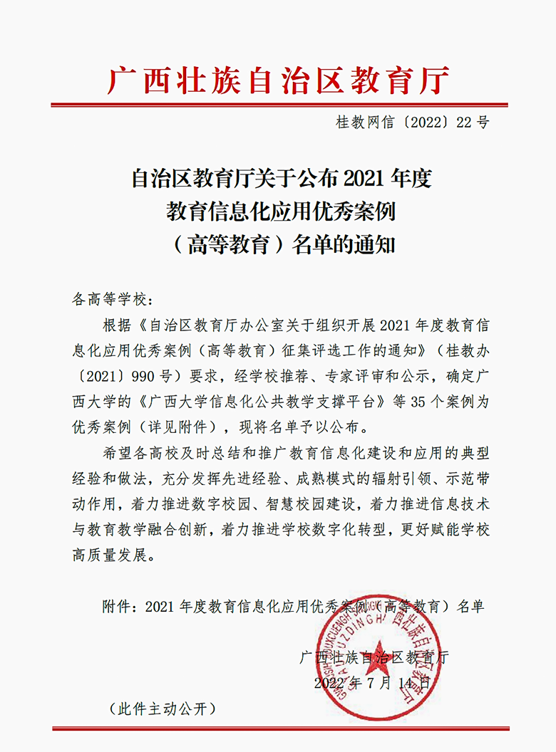 近日,自治區(qū)教育廳發(fā)布《關(guān)于公布2021年度教育信息化應(yīng)用優(yōu)秀案例(高等教育)名單的通知》,經(jīng)學(xué)校推薦、專家評審和公示,我校申報(bào)的《桂林理工大學(xué)智慧校園數(shù)據(jù)治理與服務(wù)》和《桂林理工大學(xué)全場景數(shù)據(jù)驅(qū)動(dòng)一體化智慧教學(xué)平臺(tái)的創(chuàng)新與實(shí)踐》2個(gè)案例,均獲評為2021年度教育信息化應(yīng)用優(yōu)秀案例。