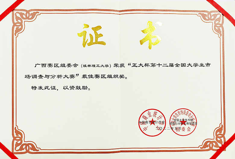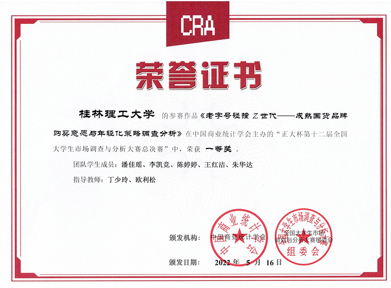 5月底,“正大杯”第十二屆全國大學生市場調(diào)查與分析大賽研究生組和本科生組總決賽在線上圓滿閉幕,我校參賽隊伍在本屆大賽中斬獲佳績。在研究生組比賽中,由丁少玲老師、歐利松老師指導,理學院統(tǒng)計學和應用統(tǒng)計專業(yè)研究生潘佳瑤、李凱競、陳婷婷、王紅潔、朱華達等5名同學共同完成的參賽作品《老字號碰撞Z世代——成熟國貨品牌購買意愿與年輕化策略調(diào)查分析》斬獲全國一等獎;本科組比賽中,由蔣遠營老師、張浩敏老師指導,理學院應用統(tǒng)計專業(yè)歐仁、黃海運、黃吉梅、龐瑩瑩等4名同學共同完成的參賽作品《道“長”論“短”,懂你所好——長、短視頻平臺用戶的選擇偏好及影響因素調(diào)查分析》榮獲全國二等獎,由歐利松老師、蔣遠營老師指導,應用統(tǒng)計及人力資源管理專業(yè)周毅、梁玫珊、黃春松、林詩欣等4名同學共同完成的參賽作品《共享盛宴,汽車可羹?——桂林市共享汽車用戶特征挖掘及其使用意愿研究》榮獲全國二等獎。同時,我校榮獲最佳賽區(qū)組織獎。