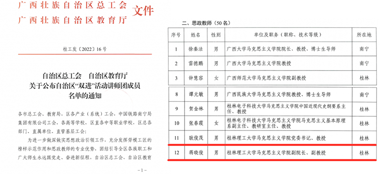 近日,自治區(qū)黨委公布2022—2024年度自治區(qū)黨委講師團(tuán)特聘教授(專家)名單,我校思政教師邱杰教授、王青山教授入選;自治區(qū)總工會(huì)、自治區(qū)教育廳下發(fā)《關(guān)于公布自治區(qū)“雙進(jìn)”活動(dòng)講師團(tuán)成員名單的通知》,我校思政教師耿俊茂教授、蔣曉俊副教授入選;共青團(tuán)廣西區(qū)委組織開(kāi)展的廣西青年講師團(tuán)學(xué)習(xí)習(xí)近平總書(shū)記在慶祝中國(guó)共產(chǎn)主義青年團(tuán)成立100周年大會(huì)上重要講話精神集中備課會(huì),我校材料科學(xué)與工程學(xué)院團(tuán)委書(shū)記趙思聰、馬克思主義學(xué)院教師劉穎潔分別作為團(tuán)干部、高校青年教師和青年理論專家出席。