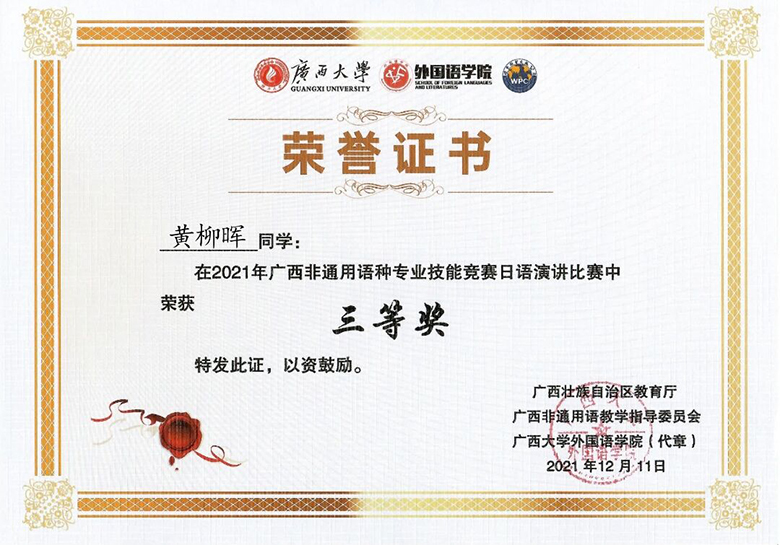 黃柳暉同學(xué)獲得2021年廣西通用語(yǔ)種專業(yè)技能競(jìng)賽日語(yǔ)演講比賽高年級(jí)組三等獎(jiǎng)