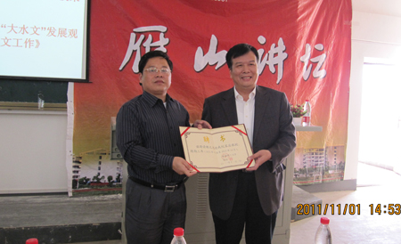 11月1日下午,應(yīng)我校邀請,自治區(qū)水文水資源局黨組書記、局長魏文達(dá)教授級高級工程師做客雁山講壇,在雁山校區(qū)06508教室為我校水文與水資源工程及相關(guān)專業(yè)師生作學(xué)術(shù)報告。 講座開始前在現(xiàn)場舉行了簡短而隆重的儀式,學(xué)校副校長吳志強教授代表學(xué)校給魏文達(dá)高級工程師頒發(fā)了聘書,聘請他為我??妥淌?。 隨后,魏局長以《積極踐行“大水文”發(fā)展觀 全面做好新時期水文工作》為題,分別從“大水文”觀念的提出及其基本內(nèi)涵、發(fā)展體系這三個方面論證了踐行“大水文”發(fā)展觀是當(dāng)前水文水資源形勢發(fā)展的需要、歷史的必然選擇,進(jìn)而希望大家充分認(rèn)識水文事業(yè)發(fā)展的重要性和緊迫性,不斷深化水文管理體制改革,全面做好新時期廣西水文工作。講座中,他還與同學(xué)們進(jìn)行了互動,詳盡地回答了同學(xué)們的提問。 本次報告使在座的師生對我區(qū)當(dāng)前水文水資源事業(yè)發(fā)展有了更新更深的認(rèn)識,大家對魏文達(dá)高工的精彩講座報以持久熱烈的掌聲。