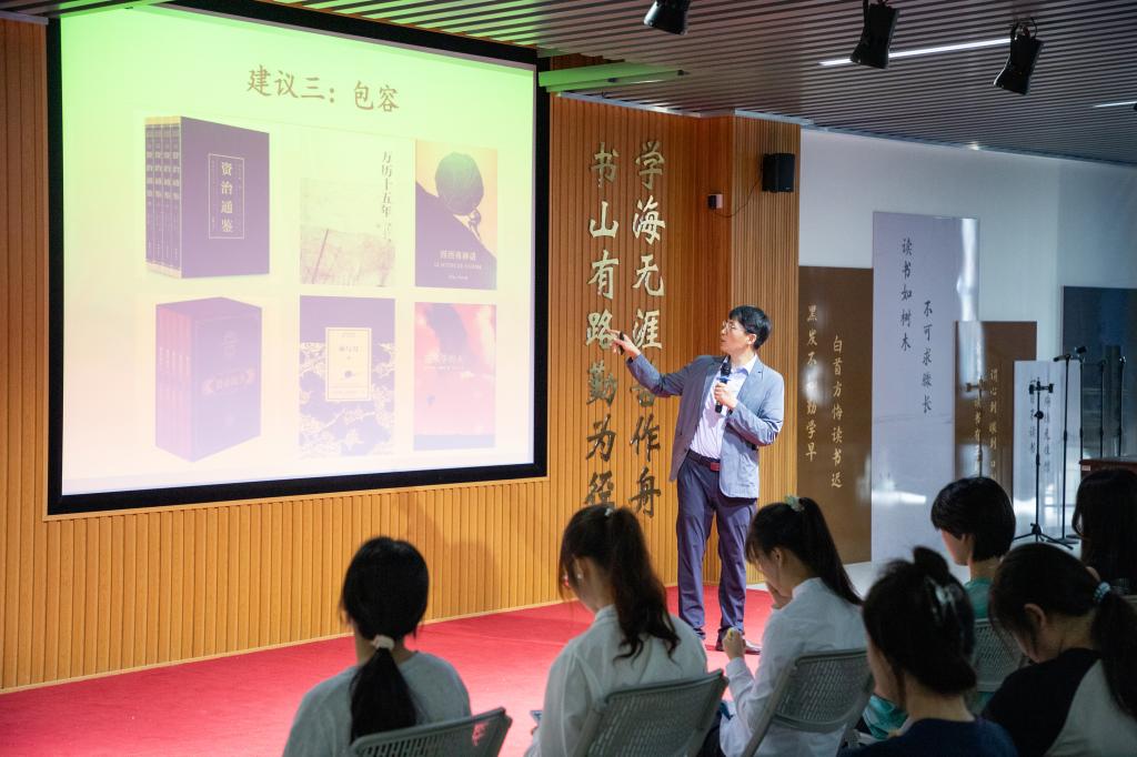 開幕式上,圖書館負(fù)責(zé)人詳細(xì)介紹了本屆讀書月活動方案,校團(tuán)委、人文素質(zhì)教育教學(xué)部相關(guān)負(fù)責(zé)人共同為2023年“讀者之星”頒發(fā)榮譽(yù)證書和紀(jì)念品,學(xué)生代表以集體誦讀《閱讀倡議書》的方式,向廣大師生發(fā)出熱誠的閱讀邀請。人文素質(zhì)教育教學(xué)部程建老師為師生讀者作題為“讀書的五個建議”的專題講座,與讀者分享“讀書要有悠然之心、讀書要有敬畏之心、不要只讀喜歡的書、讀書要進(jìn)得去出得來、讀書要活學(xué)活用”等閱讀建議。