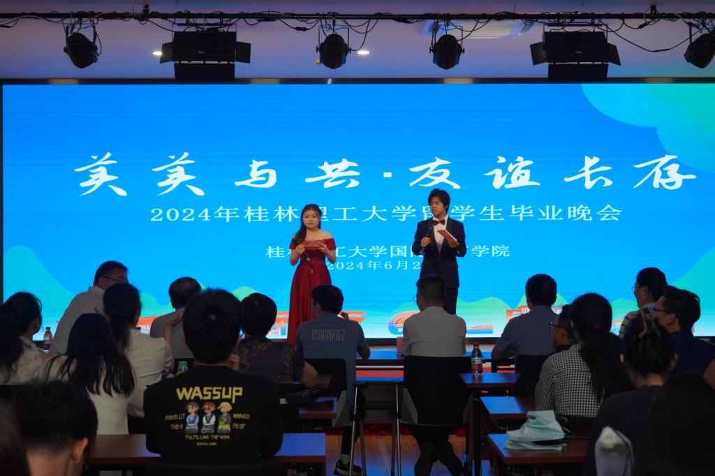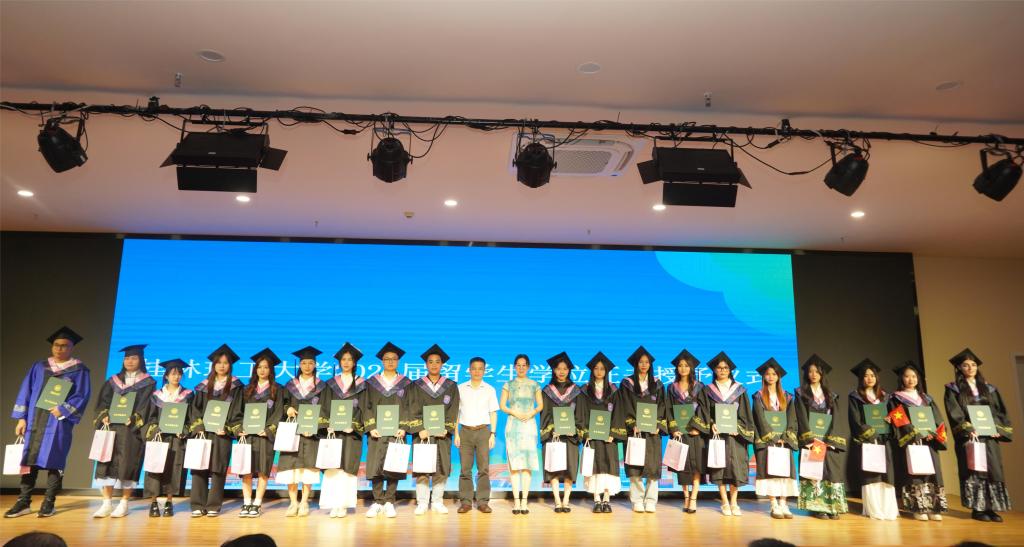 6月28日晚,我校在屏風(fēng)校區(qū)國(guó)際園區(qū)舉行2024年來(lái)華留學(xué)生畢業(yè)晚會(huì),為2024屆畢業(yè)生頒發(fā)學(xué)位證書(shū),表彰在過(guò)去一年中表現(xiàn)優(yōu)秀的來(lái)華留學(xué)生個(gè)人。宣傳部、校團(tuán)委、研究生工作部、商學(xué)院、旅游與風(fēng)景園林學(xué)院、繼續(xù)教育學(xué)院主要負(fù)責(zé)人以及國(guó)際教育學(xué)院領(lǐng)導(dǎo)班子出席晚會(huì)。國(guó)際教育學(xué)院師生代表和全體2024屆來(lái)華留學(xué)畢業(yè)生參加活動(dòng)。