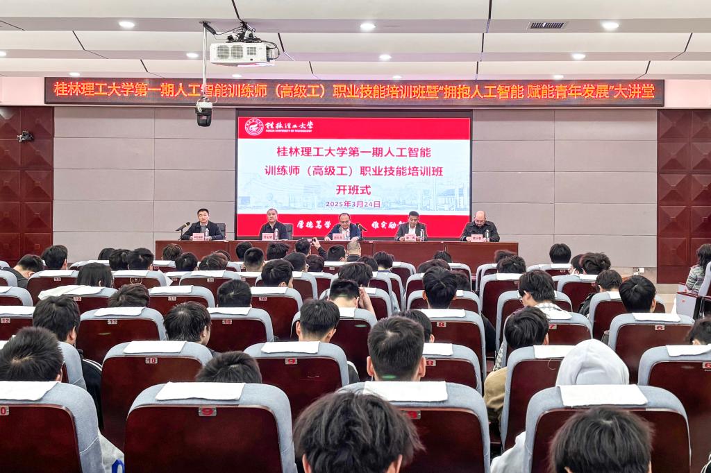 為積極響應(yīng)國(guó)家人工智能發(fā)展戰(zhàn)略,培養(yǎng)高素質(zhì)人工智能技術(shù)人才,助力學(xué)校青年學(xué)子職業(yè)發(fā)展,促進(jìn)高質(zhì)量就業(yè)創(chuàng)業(yè),3月24日,我校第一期人工智能訓(xùn)練師(高級(jí)工)職業(yè)技能培訓(xùn)班暨“擁抱人工智能 賦能青年發(fā)展”大講堂開班式在雁山校區(qū)地學(xué)院報(bào)告廳順利舉辦。學(xué)校黨委常委、副校長(zhǎng)唐壯東,桂林市職業(yè)技能評(píng)價(jià)指導(dǎo)中心主任徐勇出席開班式。計(jì)算機(jī)科學(xué)與工程學(xué)院(人工智能學(xué)院)、機(jī)械與控制工程學(xué)院、繼續(xù)教育學(xué)院相關(guān)負(fù)責(zé)人,師生代表共200余人參加開班式。