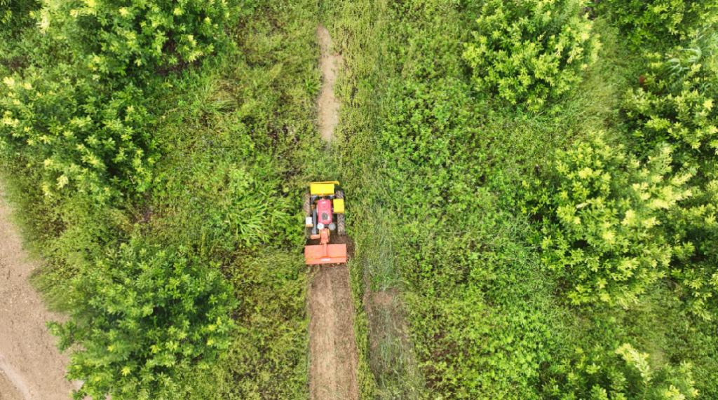 雨后,龍頭鄉(xiāng)林旺村堅果種植基地一片綠意盎然,一臺小巧的微耕機在堅果林間穿梭,刀片快速切斷雜草、松解板結(jié)土壤。項目負責人覃文海手持遙控器,精準操控著微耕機進行林間作業(yè)。