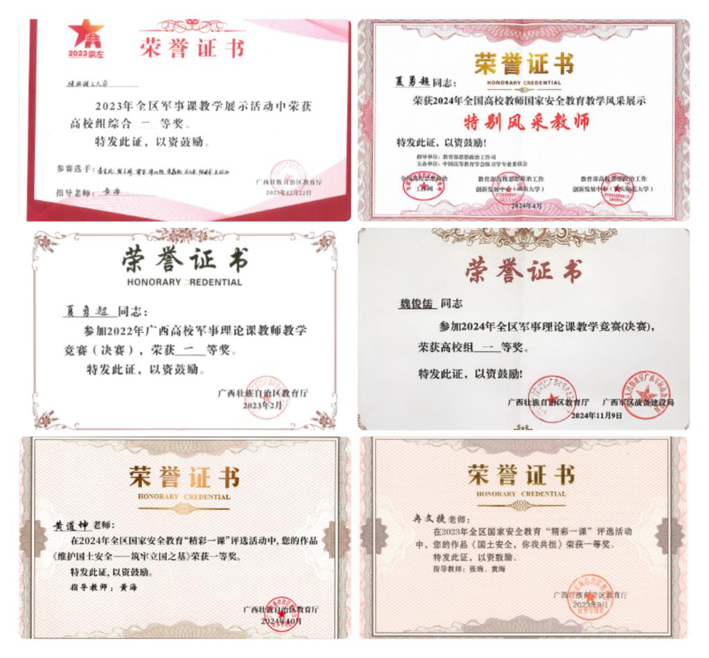 堅持以國防教育為根本,一體推進(jìn)新生軍訓(xùn)、征兵動員與教學(xué)科研工作。一是創(chuàng)新軍訓(xùn)模式,增強國防教育實效。開展體驗式、沉浸式特色軍訓(xùn),將軍事訓(xùn)練與急救技能、消防演練、無人設(shè)備使用、情景對抗有機融合,體現(xiàn)“戰(zhàn)”味、突出“兵”味、保持“軍”味,軍訓(xùn)短視頻總點擊量超數(shù)百萬次,育人成效與社會反響顯著。二是深化軍地協(xié)同,構(gòu)建特色教育體系。與陸軍特戰(zhàn)學(xué)院共建教學(xué)實踐平臺,將愛國主義、集體主義等思政元素融入課程,構(gòu)建“一體兩翼三結(jié)合”國防教育體系。三是堅持以賽促教,提升課程建設(shè)水平。積極組織師生參加區(qū)內(nèi)外競賽,2024年榮獲全國高校教師國家安全教育教學(xué)風(fēng)采展示活動最高獎“特別風(fēng)采教師”;2022至2024年間,在全區(qū)軍事理論課教學(xué)競賽中榮獲一等獎3項、二等獎2項,在國家安全教育“精彩一課”評選中榮獲一等獎3項、二等獎2項;2023年,以總分第一名榮獲全區(qū)軍事課教學(xué)展示活動一等獎,指導(dǎo)學(xué)生在2023全區(qū)高校安全教育微電影微視頻微動漫征集評選活動中獲二等獎1項、三等獎1項,并在全國高校學(xué)生國家安全素養(yǎng)展示活動中獲優(yōu)秀組織獎。四是完善征兵機制,高質(zhì)量完成征兵任務(wù)。建立“一人一冊”預(yù)檢機制,五年來組織超900名意向?qū)W生預(yù)檢。連續(xù)五年超額完成征兵任務(wù),入伍完成率均超115%以上,多次榮獲桂林市、七星區(qū)征兵工作“先進(jìn)單位”。