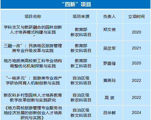 旅游管理、酒店管理專業(yè)通過(guò)聯(lián)合國(guó)旅游組織教育認(rèn)證;文化旅游產(chǎn)業(yè)學(xué)院獲批自治區(qū)級(jí)現(xiàn)代產(chǎn)業(yè)學(xué)院,智慧文旅與數(shù)字景觀實(shí)驗(yàn)教學(xué)中心獲批自治區(qū)級(jí)實(shí)驗(yàn)教學(xué)中心;獲自治區(qū)級(jí)虛擬教研室1個(gè),自治區(qū)級(jí)基層教學(xué)組織2個(gè);獲國(guó)家級(jí)新農(nóng)科、新文科、新工科研究與實(shí)踐項(xiàng)目各1項(xiàng),獲自治區(qū)級(jí)新農(nóng)科1項(xiàng)、新文科2項(xiàng);學(xué)院教師廣西高等教育自治區(qū)級(jí)教學(xué)成果獎(jiǎng)3項(xiàng);獲全國(guó)高校教師教學(xué)創(chuàng)新大賽廣西賽區(qū)一等獎(jiǎng)2項(xiàng)、二等獎(jiǎng)1項(xiàng)。