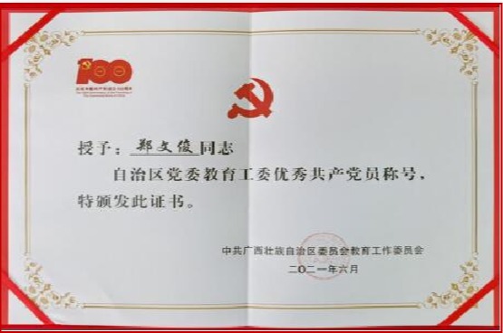 鄭文俊同志獲自治區(qū)黨委教育工委優(yōu)秀共產(chǎn)黨員