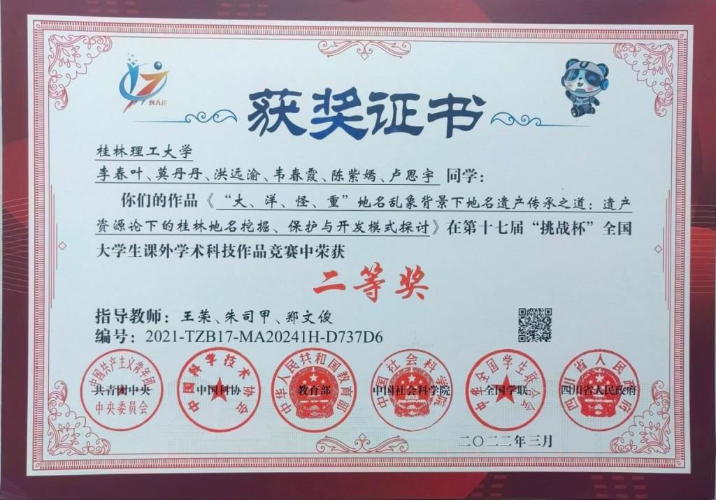 學(xué)生獲第十七屆“挑戰(zhàn)杯”全國(guó)大學(xué)生課外學(xué)術(shù)科技作品競(jìng)賽二等獎(jiǎng)