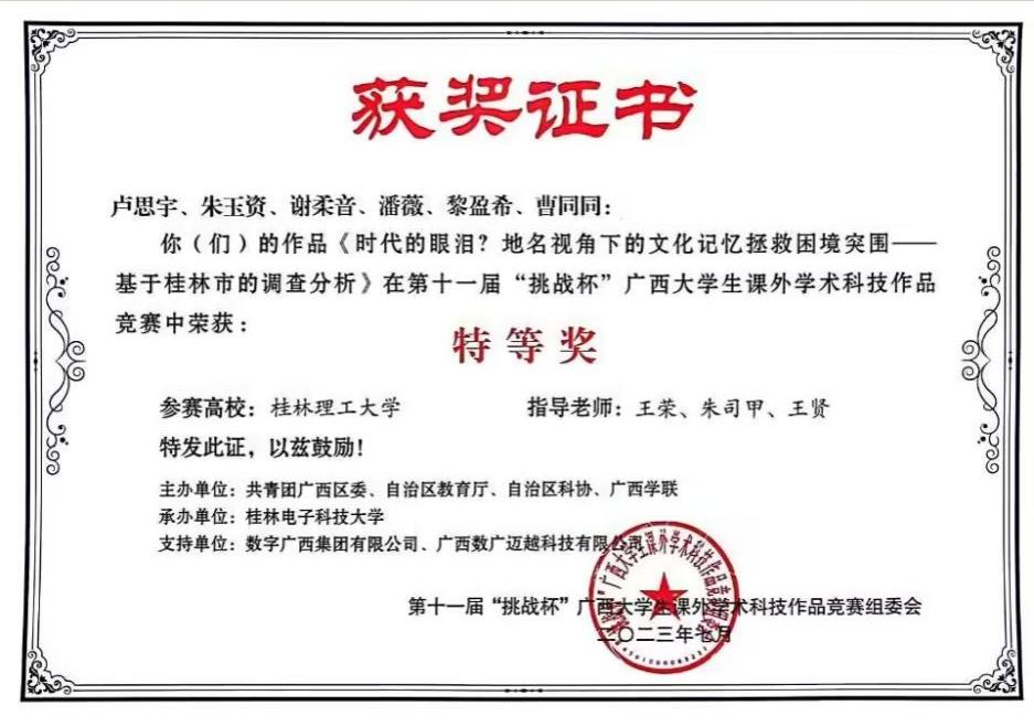 學(xué)生獲第十一屆“挑戰(zhàn)杯”廣西大學(xué)生課外學(xué)術(shù)科技作品競(jìng)賽特等獎(jiǎng)